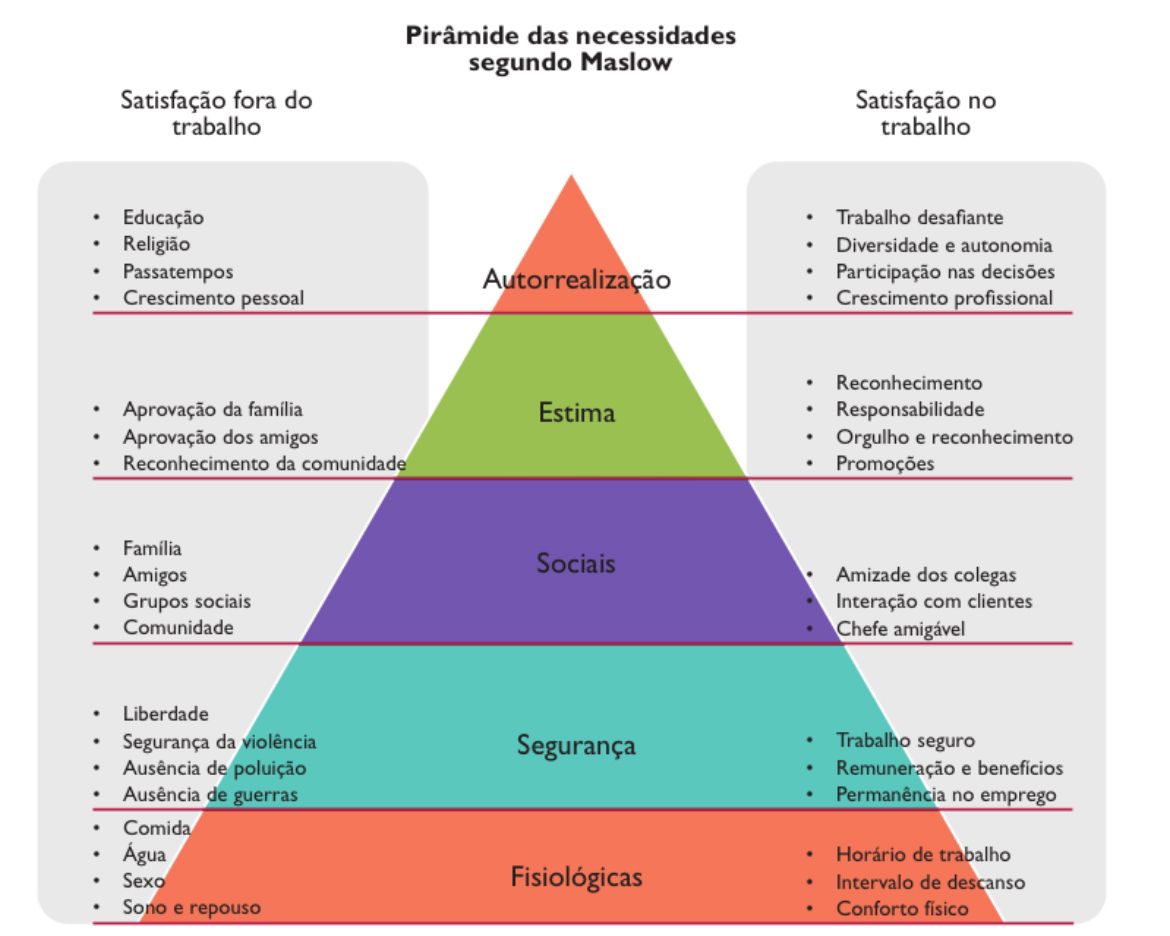 Abraham Maslow, psicólogo estadunidense, em 1954 estruturou sua teoria da motivação com base no atendimento das necessidades humanas. Ele relacionou a motivação das pessoas a um conjunto de necessidades denominadas por ele como: fisiológicas, segurança, sociais, status e autorrealização. Ele explicou as necessidades do ser humano em diferentes níveis, esclarecendo que os três primeiros dependem do meio exterior para a satisfação e os dois últimos dependem do próprio indivíduo para sua realização.